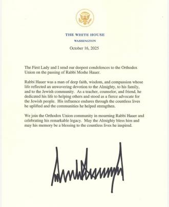 Washington, D.C. - Oct. 18, 2025 - President Trump expressed his condolences upon learning of the sudden petira of Rabbi Moshe Hauer, ZTV'L.