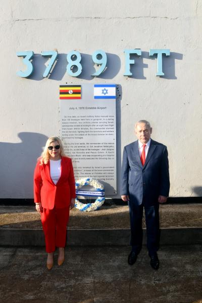Prime Minister Benjamin Netanyahu and his wife Sara, today (Monday, 3 February 2020), laid a wreath near the memorial sign for Operation Entebbe, which is posted on the control tower at Entebbe Airport.
