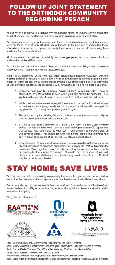 We are all joined in prayer for the success of these efforts at containment, and for a speedy recovery for all those already affected. We acknowledge the pain and confusion that these efforts have imposed on everyone, especially those who will celebrate Pesach away from family and/or completely alone.