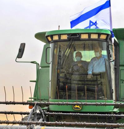 At the end of his visit to the Gaza area, the president began the wheat harvest season in the fields of Kibbutz Sa’ad, accompanied by the field manager Chaim Landsman and wheat grower Yehuda Nir. Yehuda drove the combine harvester with the president sitting in the cab, and together they began harvesting this season’s wheat with hopes of bumper yields and security.