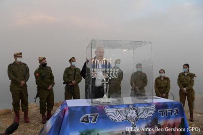 The president then carried on to light candles for the sixth night of Chanukah with the men and women of the Valleys Division at Metzukei Dragot, overlooking the Dead Sea. The president spoke with brigade commander Col. Bezalel Shneier about current challenges and heard from the soldiers deployed in the area about where they came from and their experience of service. The Book of the Desert reconnaissance unit comprises soldiers who operate as trackers in the Jordan Valley, some of whom with experience as shepherds on farms across the country. Battalion 47 is one of the units with male and female soldiers, deployed on the eastern border of the State of Israel and operational day and night with the local population to maintain stability and security.