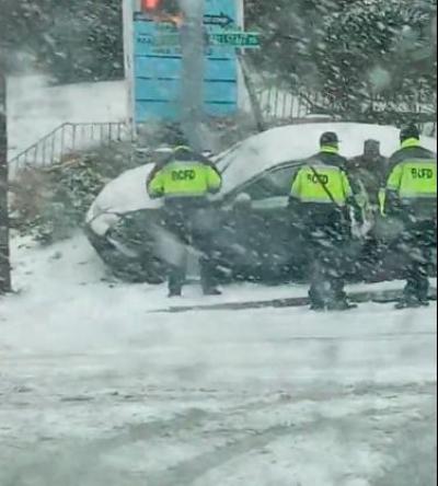 The corner of Park Heights and Fallstaff is blocked off due to a major accident, and Taney road going upwards is blocked with many vans stuck in the snow unable to proceed upwards.