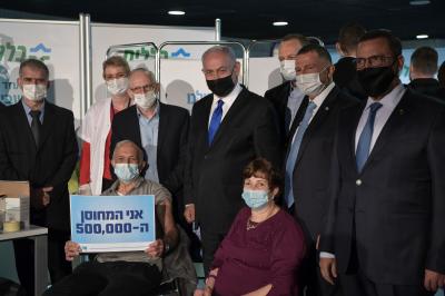 "First, I would like to commend Herzl and Fadila Levy, who are the 500,000th people to be vaccinated. It warms the heart to see the citizens of Israel joining in to help citizens of Israel, especially the elderly, emerge from great darkness into great light.