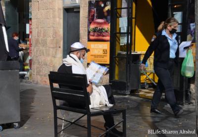 The photo essay is of Jerusalem scenes on January 6, including on Jaffa Road, where one man found time late morning to sit and pray with tallis and tefillin before lunchtime food deliveries.