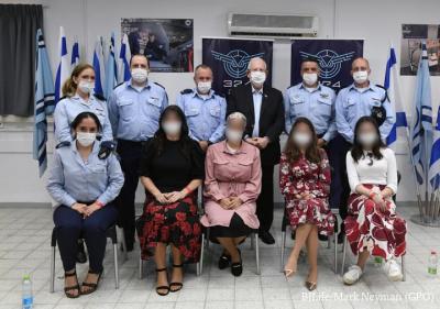 The president also spoke with participants in “Tochna be’Emuna”, a program that integrates and trains Charedi women for technology roles in IAF unit Ofek 324. The women have degrees in computer science and software engineering, and come from Bnei Brak, Lod and Jerusalem.
