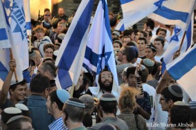 Jerusalem, Israel - June 15, 2021 - For close to fifty years, the Yom Yerushalayim Flag Dance - ריקודגלים, Rikud Degalim - has been a tradition appreciated by Israeli religious Zionists and grown in size. This year the march was postponed and held on Tuesday evening, June 15, 2021. The altered route stared at HaNevim Street, went toward Damascus Gate, but did not go in the gate as in the past, but proceeded along the outside of the Old City to Jaffa Gate.