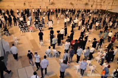 Showing a green pass was required to get near the main building of the Western Wall Heritage Foundation and tunnel tours. People were masked, however, mostly not in the Plaza area. The sounds of singing were interrupted with repeated shofar blasts. The 'corona security' units were dressed in clearly marked vests. Social distance was maintained by the majority in the men's prayer area, which was preset with shade for Thursday morning bar mitzvah celebrations.
