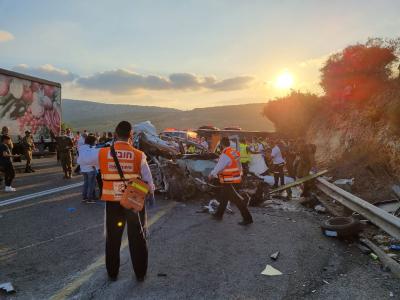 United Hatzalah volunteer EMT and chapter Head of the Ma'alot region reported from the scene: "The incident involves a bus that is flipped over on its side as well as a large van and a private car. Thus far our volunteers have treated upwards of 20 people injured who are conscious. There are other injured who are unconscious as well as those who are still trapped that we haven't been able to reach yet. Firefighters are currently working to extricate them from the wreckage."