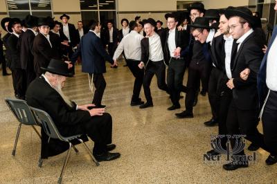 Buchorim dancing for the Rosh HaYeshiva Moreinu HaRav Aharon Feldman, shlita, at one of the three Chanukah Mesibos At Baltimore's Yeshivas Ner Yisroel (Photo Credit: Reb Eli Greengart)