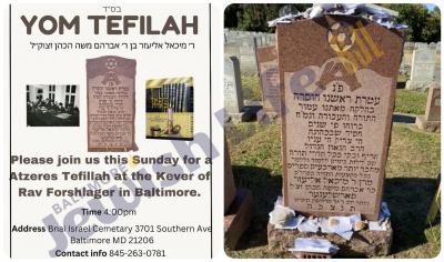 Baltimore, MD - Today, June 18, 2023 - There will be an Atzeres Tefillah at the kever of the "Gaon of Baltimore" HaRav Michoel Forshlager, ZT'L, at 4:00PM at Bnai Israel Cemetery 3701 Southern Ave, Baltimore, MD 21214
