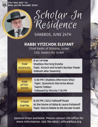 This Shabbos at Bnai Jacob Shaarei Zion: Rabbi Yitzchok Elefant - Chief Rabbi of Dimona, Israel, and CEO of Rabbis for Israel