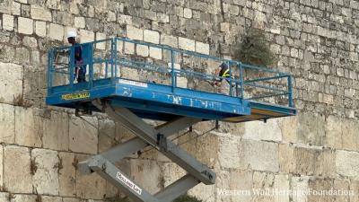 Today's extensive examination assessed the stability of the Kotel stones. A team of engineers ascended a lift and examined the durability and level of maintenance of each and every stone, following a continuous and organized process that updates and documents each inspection.