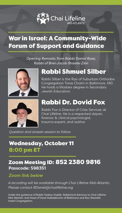 Baltimore, MD - Oct. 11, 2023 - Chai Lifeline Mid-Atlantic is pleased to share a recording of tonight's zoom session featuring Rabbi Daniel Rose, Rabbi Shmuel Silber and Rabbi Dr. Dovid Fox offering guidance and comfort during these difficult times. Thank you to each of these rabbanim for sharing his time and inssight with the community. We apologize for a technical glitch that prevented many from joining live and are thankful for the overwhelming response to this presentation.