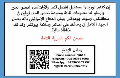 The IDF, in Arabic, promised Gazans "the utmost effort to provide you and your loved ones safety, as well as a financial reward.