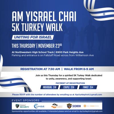 Baltimore, MD - Nov. 21, 2023 -  Join us this Thursday, November 23rd for the Am Yisrael Chai 5K Turkey Walk