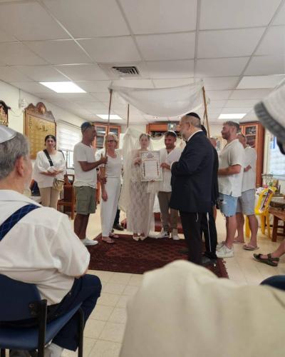 Rabbi Shlomo Ra'anan of the "Ayelet HaShachar" organization wrote that Mika Meisner from Kibbutz Be'eri and Elad Dubnov from Tal Shahar decided to get married specifically in the synagogue of Kibbutz Be’eri. One of the blessings under the chuppah was recited by Aviyad Bachar, the hero from Kibbutz Be'eri, who when fighting the terrorists on Simchat Torah, tragically lost his wife, his son and also his leg.
