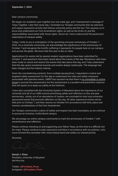 I have also consulted with the University System of Maryland about the importance of our university and all of our USM schools prioritizing safety and reflection on this one-year anniversary. Jointly, out of an abundance of caution, we concluded to host only university-sponsored events that promote reflection on this day. All other expressive events will be held prior to October 7, and then resume on October 8 in accordance with time, place, and manner considerations of the First Amendment.