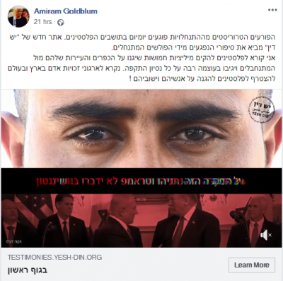Goldblum continued: "I'm not talking about the haredis who live in Beitar Illit and Modiin Illit, rather about the masses, mainly the [one's who wear] knitted kippas, who are in the heart of the Palestinian state and who regularly support all of their people's terrorist activity."