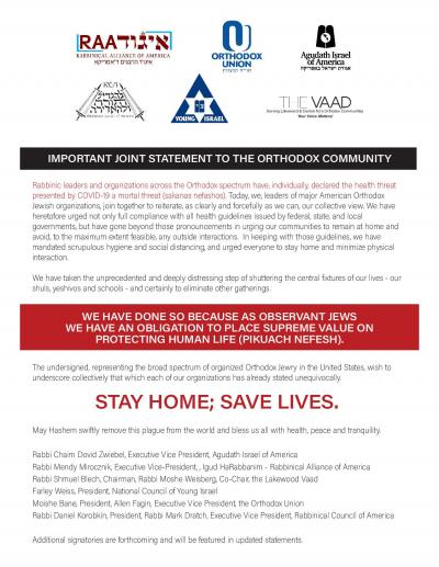Today, we, leaders of major American Orthodox Jewish organizations, join together to reiterate, as clearly and forcefully as we can, our collective view. We have heretofore urged not only full compliance with all health guidelines issued by federal, state, and local governments, but have gone beyond those pronouncements in urging our communities to remain at home and avoid, to the maximum extent feasible, any outside interactions. In keeping with those guidelines, we have mandated scrupulous hygiene and social distancing, and urged everyone to stay home and minimize physical interaction.