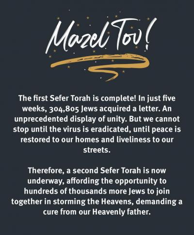 Baltimore, MD - Apr. 26, 2020 - The Miracle Sefer Torah began as a fledgling, grassroots effort to do something positive in the face of the pandemic. Now, it has united the Jewish world. In just five weeks, the Torah, written with the intention of ending the virus, is completely filled, organizers said.