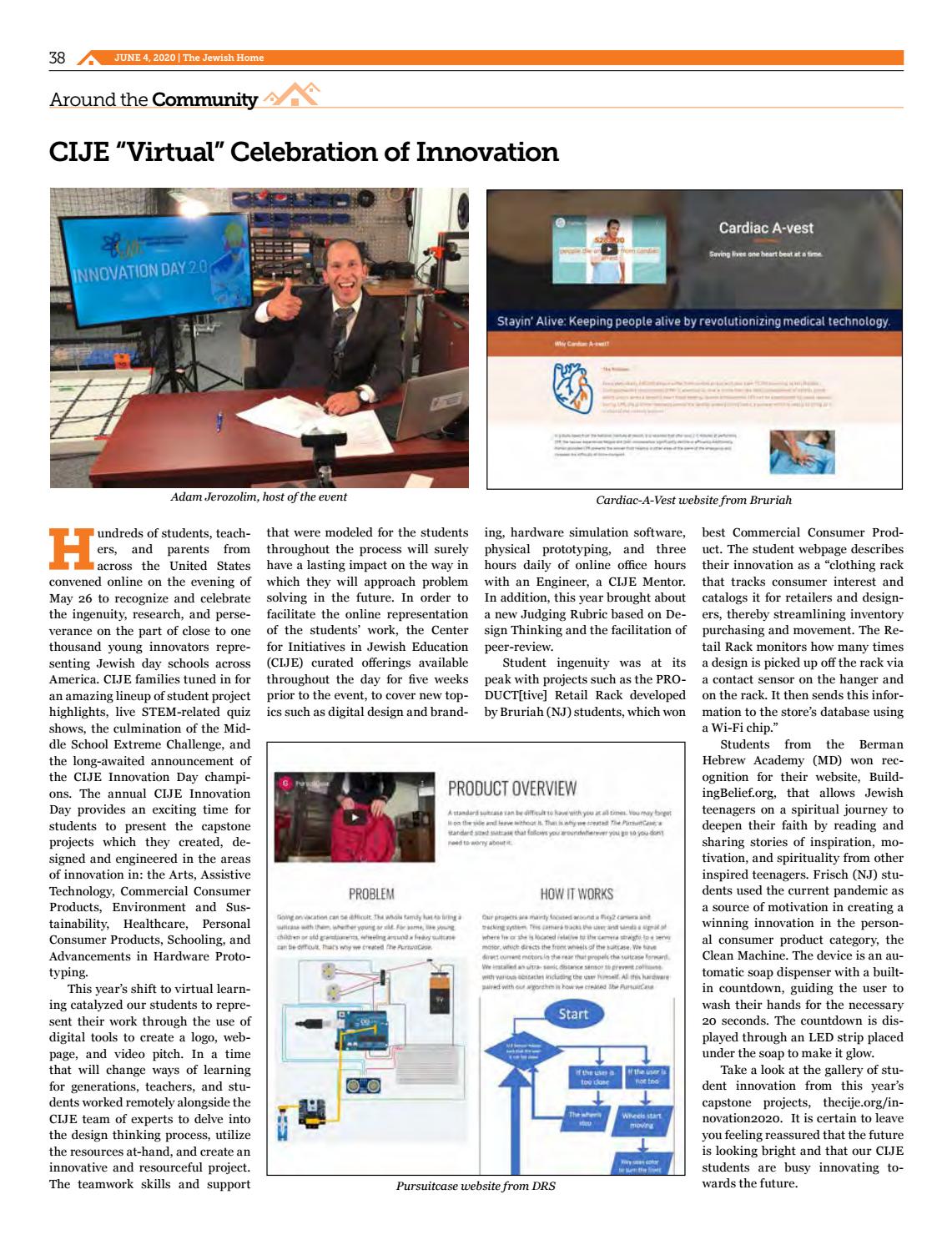 Baltimore, MD - June 10, 2020 - The Center for Initiatives in Jewish Education (CIJE) is a non-profit organization that works with over 200 Jewish schools in 18 states across America, impacting over 45,000 students annually. Our high school program focuses on an engineering capstone team project, which students present at our annual CIJE Innovation Day. This year students from the following local schools participated in our high school program: