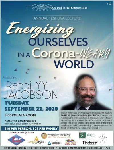 For its annual Teshuva Drasha, Shearith Israel is bringing Rabbi Y. Y. Jacobson’s message live to Baltimore through a Zoom address right when we need it, at the beginning of the Asseres Yemai Teshuva.  Join us by Zoom at 8 pm on Tuesday September 22 as Rabbi Y. Y. Jacobson leads us in “Energizing Ourselves in a Corona Weary World”.