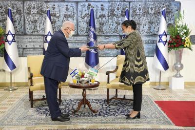 Ambassador Feruza Makmudova of Uzbekistan then presented her credentials to the president, the first female ambassador in the Uzbek foreign service. “Uzbekistan proves to the whole world that there is no conflict between Christians and Moslems,” said the president. “We hope to prove that we canlive together in peace, as Jews, Moslems and Christians, and members of all faiths, do in Israel.” The ambassador responded, “Thank you for your warm welcome. I bring greetings from the president and government of Uzbekistan. Since our countries established diplomatic relations, we have a dialogue of mutual understanding and respect. Now, we can develop new projects and initiatives,” she said.