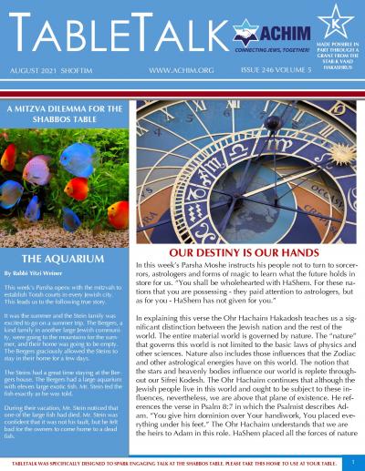 Baltimore, MD – Aug. 2021 - Every Shabbos table offers every Jewish family an incredible opportunity by which they can share their joy for Shabbos, for Yiddishkeit and for HaShem with their children. Unfortunately, our schedules are hectic and many people don’t have the time to prepare themselves to utilize the Shabbos table to its fullest. Therefore, we at ACHIM created TableTalk as a pre-packaged talking points pamphlet which is attractive, fun and has something for everyone. Limited copies are distributed to many shuls on a weekly basis but they are snatched up very quickly. Get yours ASAP or click on the graphic below and print your own.