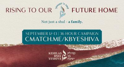 "Kehilas Bnei Yeshiva is a place where young families go to connect and grow in their Avodas Hashem, where they can forge a close relationship with the Rav, and be able to confide with Daas Torah. The members feel like Kehilas Bnei Yeshiva is their shul and their second home, and that the shul is there for them and their families. As the shul grows, the walls of our Bais Medrash must also grow to enable more young families to be a part of this great institution. Therefore, at this time we need to look into buying and investing in a place to reach and service more people in our community. We are ever so grateful and could not have gotten here without the support and effort from all of our esteemed members. We thank the Ribono Shel Olam for all His kindness until this point, and may it be His will that we continue in our growth and success." -Rabbi Akiva Meister