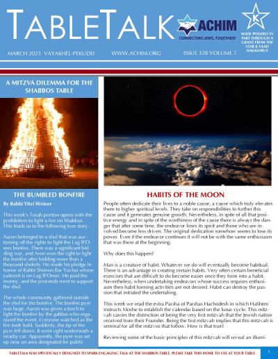 Baltimore, MD – Mar. 2023 - Every Shabbos table offers every Jewish family an incredible opportunity by which they can share their joy for Shabbos, for Yiddishkeit and for HaShem with their children. Unfortunately, our schedules are hectic and many people don’t have the time to prepare themselves to utilize the Shabbos table to its fullest. Therefore, we at ACHIM created TableTalk as a pre-packaged talking points pamphlet which is attractive, fun and has something for everyone. Limited copies are distributed to many shuls on a weekly basis but they are snatched up very quickly. Get yours ASAP or click on the graphic below and print your own.