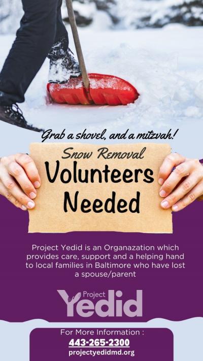 Baltimore, MD - Jan. 19, 2024 - Join us in spreading warmth and kindness this winter! Let's come together to help local Almanos (widows) by volunteering to shovel their snow. Volunteers ages 12 and above are welcome. A small act of kindness can make a big difference in someone's day. Grab a shovel, lend a helping hand, and let's show everyone what a caring and compassionate community Baltimore is. Your time and effort can bring smiles and comfort to those who need it most, and you'll also be rewarded with a significant Mitzvah.