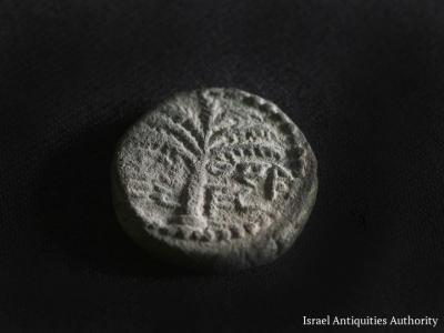 6. The “Eleazar the Priest” Coin. On the other side of the coin appears a cluster of grapes, surrounded by the inscription "One year for the redemption of Israel" in ancient Hebrew script. Photo: Emil Aladjem, Israel Antiquities Authority