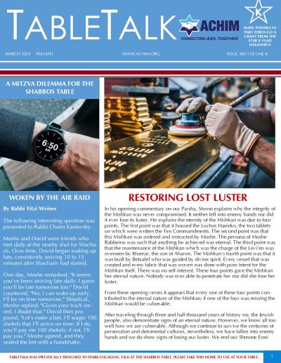 Baltimore, MD – Mar. 2024 - Every Shabbos table offers every Jewish family an incredible opportunity by which they can share their joy for Shabbos, for Yiddishkeit and for HaShem with their children. Unfortunately, our schedules are hectic and many people don’t have the time to prepare themselves to utilize the Shabbos table to its fullest. Therefore, we at ACHIM created TableTalk as a pre-packaged talking points pamphlet which is attractive, fun and has something for everyone. Limited copies are distributed to many shuls on a weekly basis but they are snatched up very quickly. Get yours ASAP or click on the graphic below and print your own.