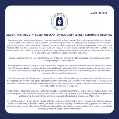 As the U.S.’s highest-ranking Jewish elected official ever, Senator Schumer has surely reached a pinnacle in American politics. But assuming the role of speaking on behalf of “a silent majority” of American Jewry goes too far. He has no such authority or power. If anything, his historic role and high station in our nation confer upon him the responsibility to carefully heed his words and use them wisely