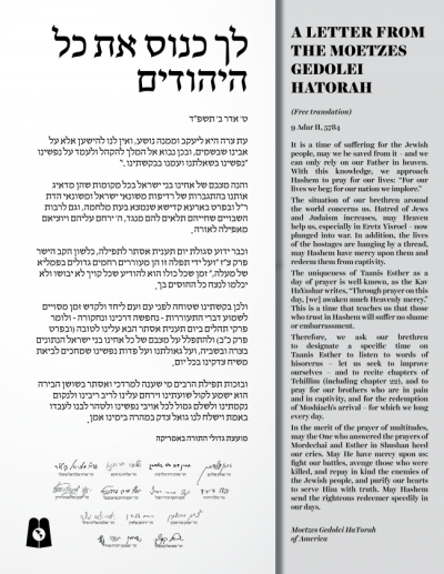 Therefore, we ask our brethren to designate a specific time on Taanis Esther to listen to words of hisorerus – let us seek to improve ourselves – and to recite chapters of Tehillim (including chapter 22), and to pray for our brothers who are in pain and in captivity, and for the redemption of Moshiach’s arrival – for which we long every day.