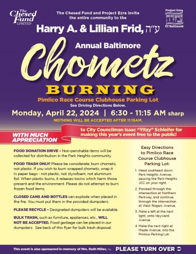 Baltimore, MD - Apr. 2, 2024  - Chesed Fund & Project Ezra Annual Community-Wide Baltimore Chometz Burning 5784/2024
