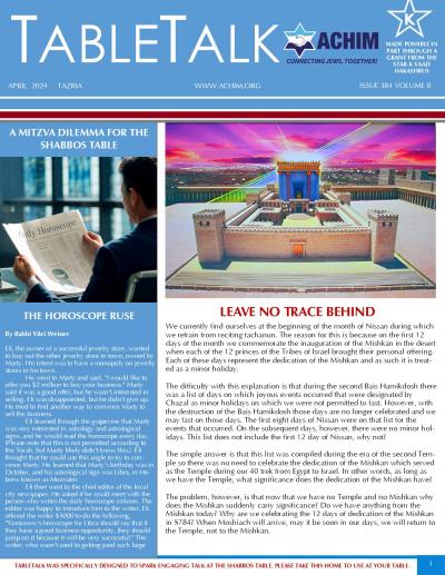 Baltimore, MD – Apr. 2024 - Every Shabbos table offers every Jewish family an incredible opportunity by which they can share their joy for Shabbos, for Yiddishkeit and for HaShem with their children. Unfortunately, our schedules are hectic and many people don’t have the time to prepare themselves to utilize the Shabbos table to its fullest. Therefore, we at ACHIM created TableTalk as a pre-packaged talking points pamphlet which is attractive, fun and has something for everyone. Limited copies are distributed to many shuls on a weekly basis but they are snatched up very quickly. Get yours ASAP or click on the graphic below and print your own.