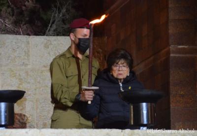 During the ceremony, Holocaust survivors light six torches with the assistance of a close relative.  First torch: Pnina Hefer; second torch: Allegra Gutta; third torch: Arie Eitani; fourth torch: Raisa Brodsky; fifth torch: Michael Bar-On; sixth torch: Izi Kabilio.