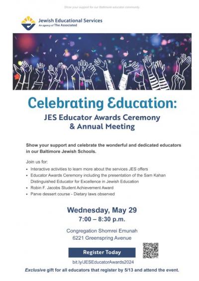 Baltimore, MD - May 16, 2024  - On Wednesday, May 29th, Jewish Educational Services, an agency of The Associated will be hosting Celebrating Education: JES Educator Awards Ceremony and Annual Meeting.  This momentous event will take place at 7:00 pm at Congregation Shomrei Emunah, where we will pay tribute to not only our incredible awardees, including the 2024 Sam Kahan Distinguished Educator, but also to the 100+ educators who were nominated for awards, and we invite you to join us to celebrate ALL the teachers in our community who dedicate themselves to their students and to Jewish Education. Registration is still open - go to bit.ly/CelebratingEducation2024.