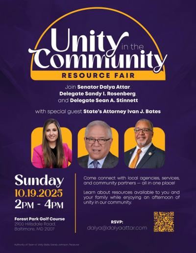Baltimore, MD - Oct. 17, 2025 - This is more than just another event — it’s a critical moment to come together as a community. Senator Dalya Attar, along with Delegate Sandy Rosenberg and Delegate Sean Stinnett, will be hosting the Unity in the Community Resource Fair, with special guest State’s Attorney Ivan J. Bates.