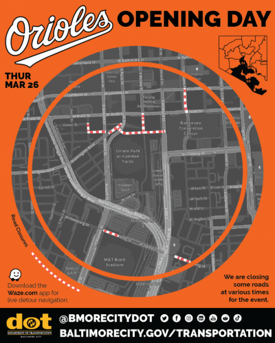 Baltimore, MD - Mar. 22, 2026 – The Baltimore City Department of Transportation would like to advise motorists of the traffic and parking modifications that will be in effect for the Baltimore Orioles opening day game at Oriole Park at Camden Yards. The Baltimore Orioles will play their home opener against the Minnesota Twins on Thursday, March 26, 2026, starting at 3:05 p.m.