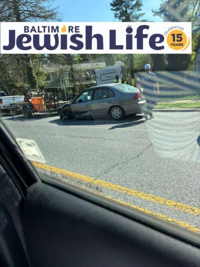 Baltimore, MD – Apr.16, 2026 – 4:00PM (BJL) An accident after the light outside of Shomrei Emunah heading toward Pickwick has traffic blocked off by a fire truck and 2 police cars.