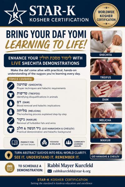 Baltimore, MD, April 30, 2026 | 13 Iyar 5786 — STAR-K Kosher Certification is proud to announce a dynamic new educational initiative designed to bring Maseches Chullin to life for Daf Yomi participants, yeshivos, kollelim and community learning groups worldwide.