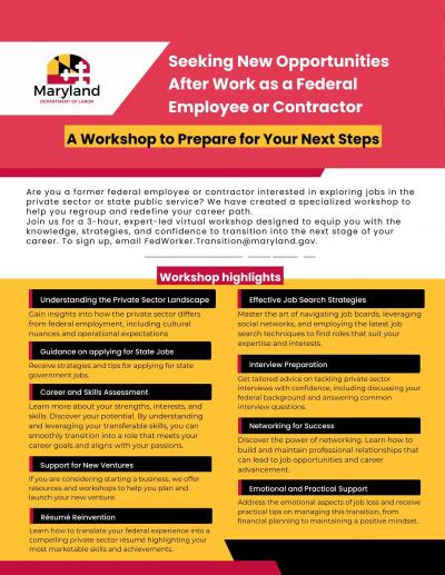 The Maryland Department of Labor's Office of Workforce Development is here to offer real support, guidance, and opportunity. Whether you’ve worked in federal service for decades or only a few years, transitioning to the private sector can be daunting. That’s why a specialized, expert-led workshop was created just for individuals like you—to help you not only manage this transition, but grow from it.